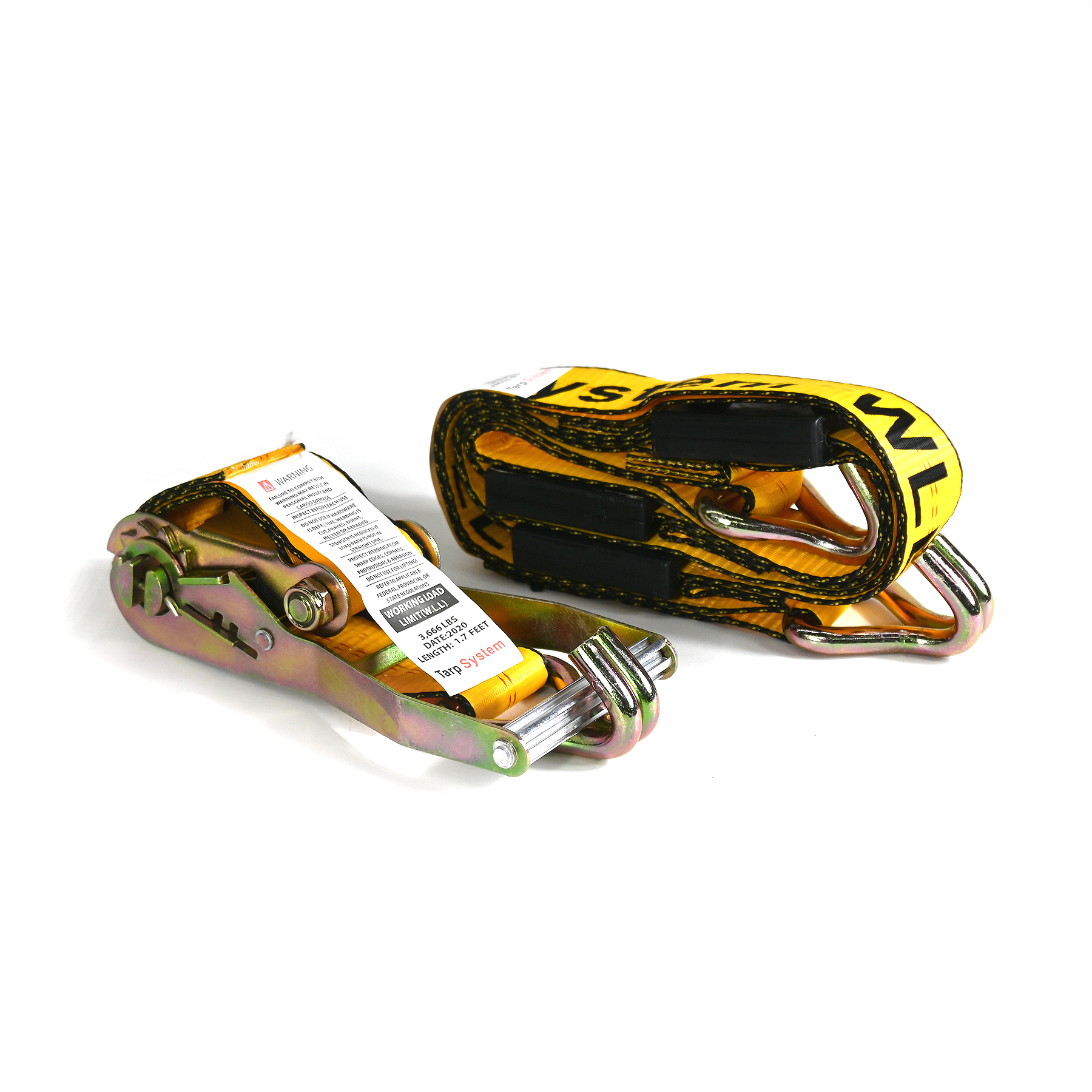 Get maximum grip and load protection with this 2" x 10' ratchet strap designed for tarp systems. Featuring three wire J-hooks for secure attachment and three rubber blocks to cushion the load, this strap ensures both strength and safety. It's ideal for securing tarps overloads on flatbeds and trailers, offering weather resistance and consistent tension. Built to meet demanding conditions, it’s a top choice for professional haulers and drivers.