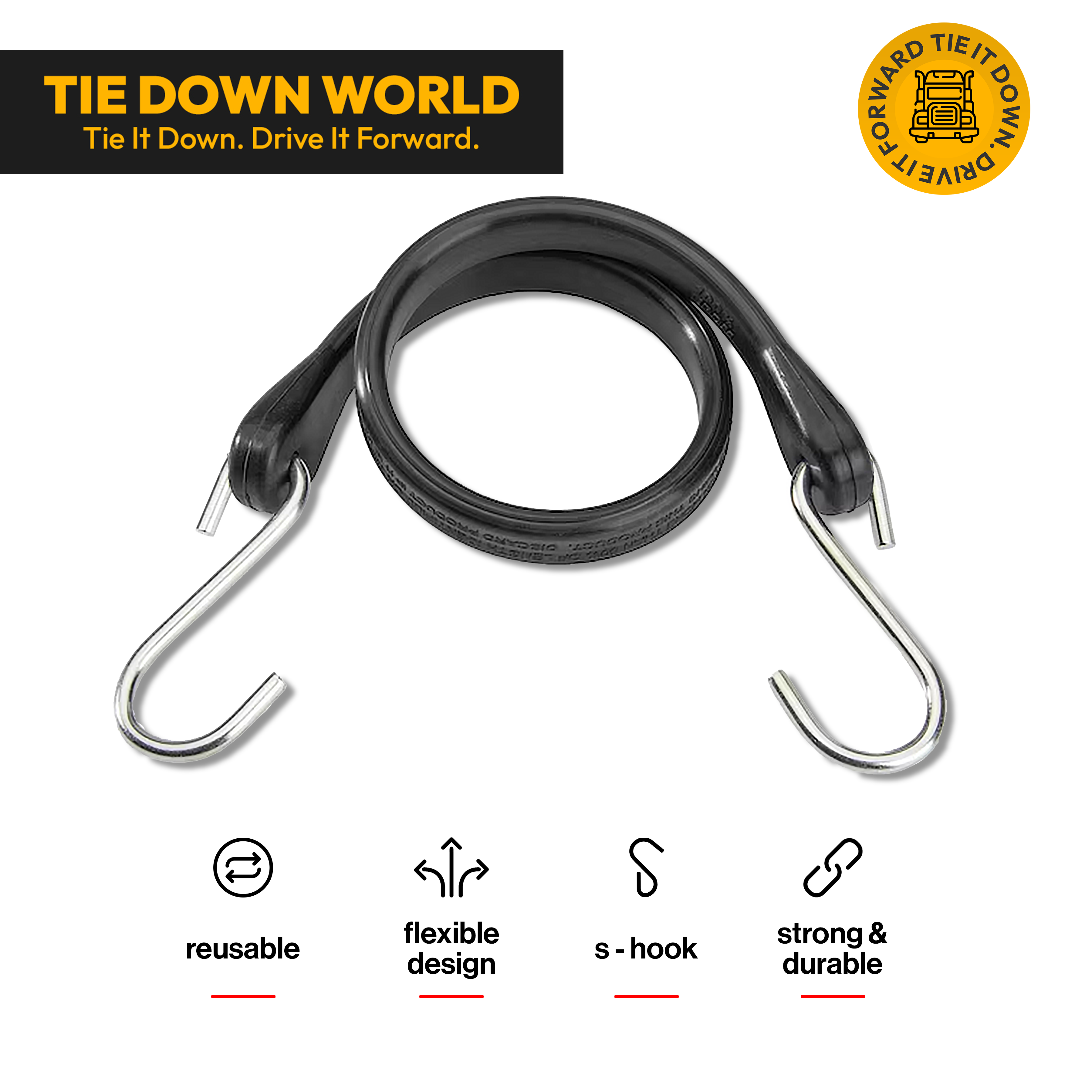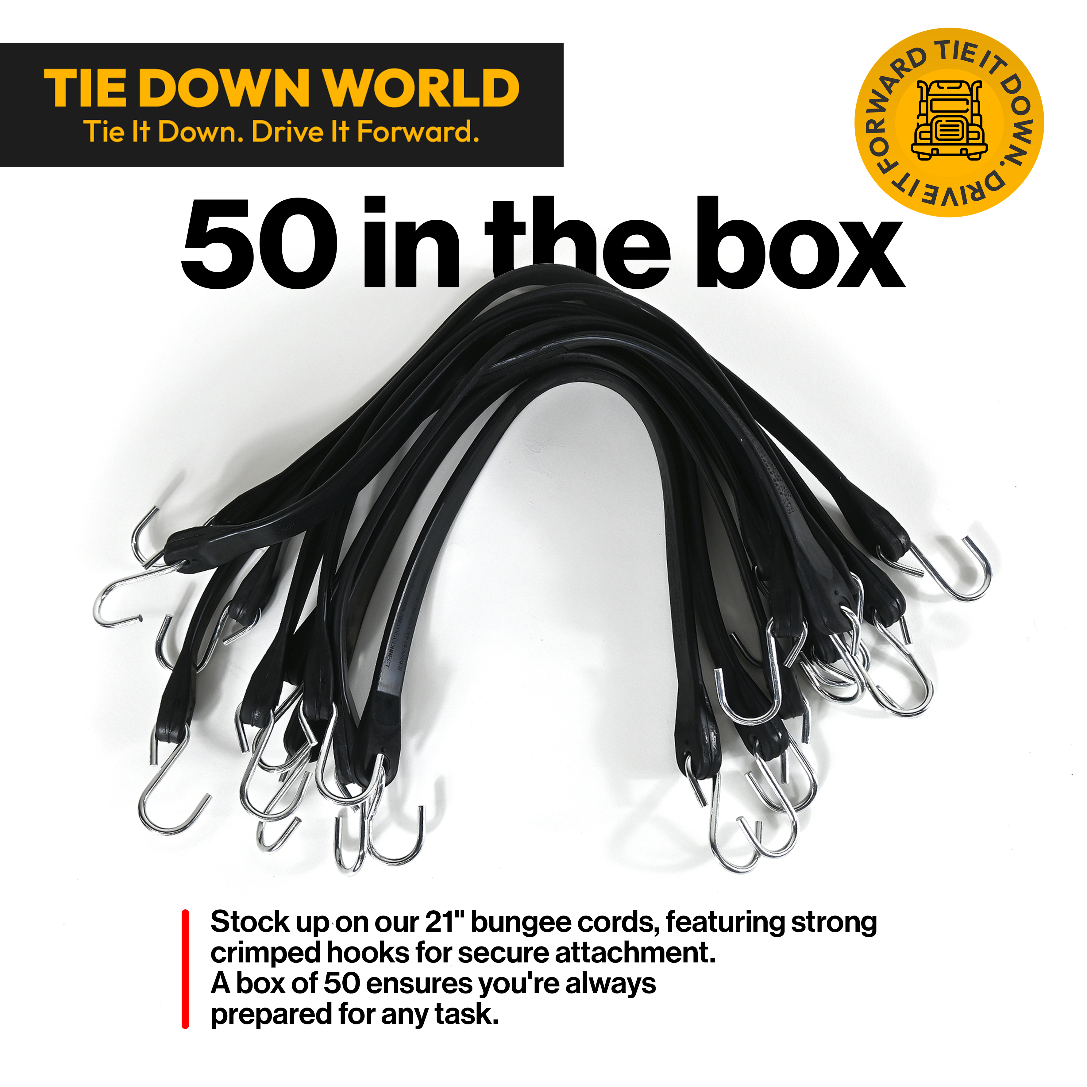 Be ready for any job with Tie Down World’s 21" Bungee Cords—built for strength, durability, and secure fastening. Each cord features heavy-duty, crimped steel hooks that stay firmly in place, making them ideal for cargo control, hauling, and everyday tasks. With 50 cords per box, you’ll never run short when it matters most.