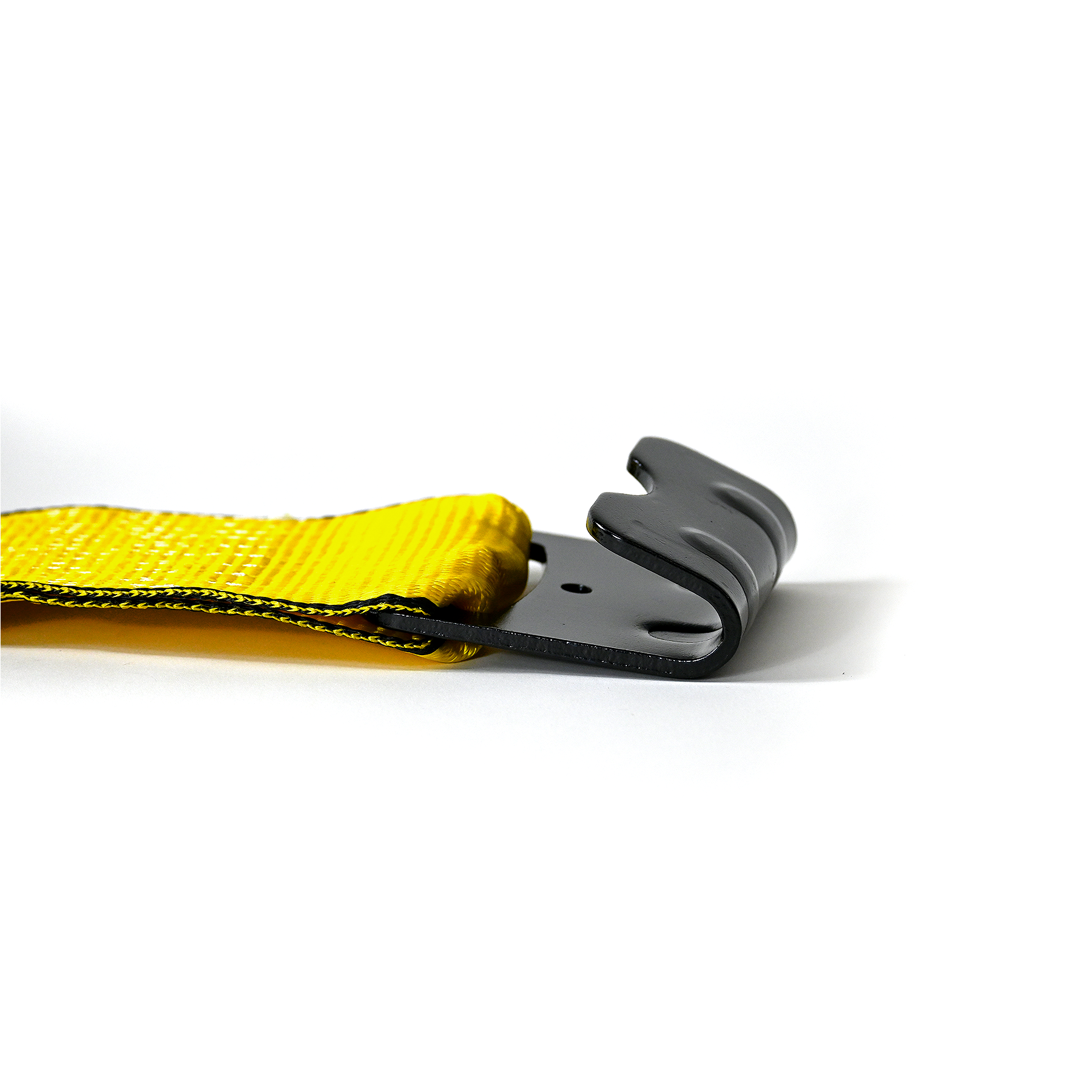 Heavy-duty winch strap with flat hook, designed for secure cargo tie-down in flatbed and transport applications.