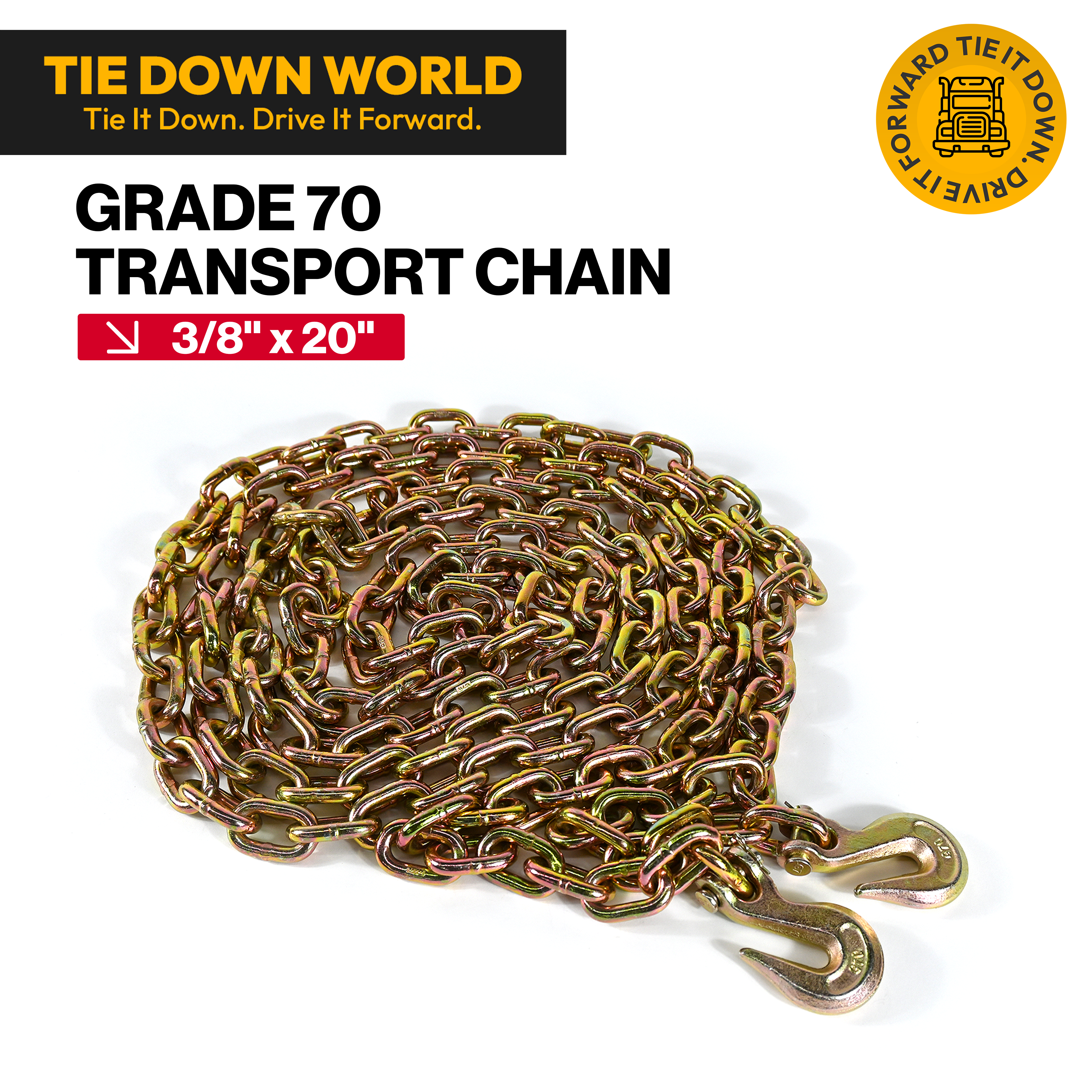 Secure your cargo with confidence using the Chain Grade 70 3/8" x 20 Feet from Tie Down World. This high-strength Grade 70 transport chain is designed for heavy-duty tie-down applications, offering durability and performance you can rely on during transport.